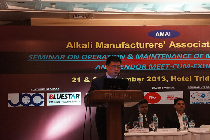 ????????由印度堿制造商協(xié)會(huì)AMAI舉辦的“離子膜電解槽運(yùn)行與維護(hù)(Operation & Maintenance of Membrane Cell Plants)”展會(huì)及研討會(huì)于2013年11月22日在印度南部最大的城市Chennai順利閉幕,我司的參展取得了熱烈的反響。