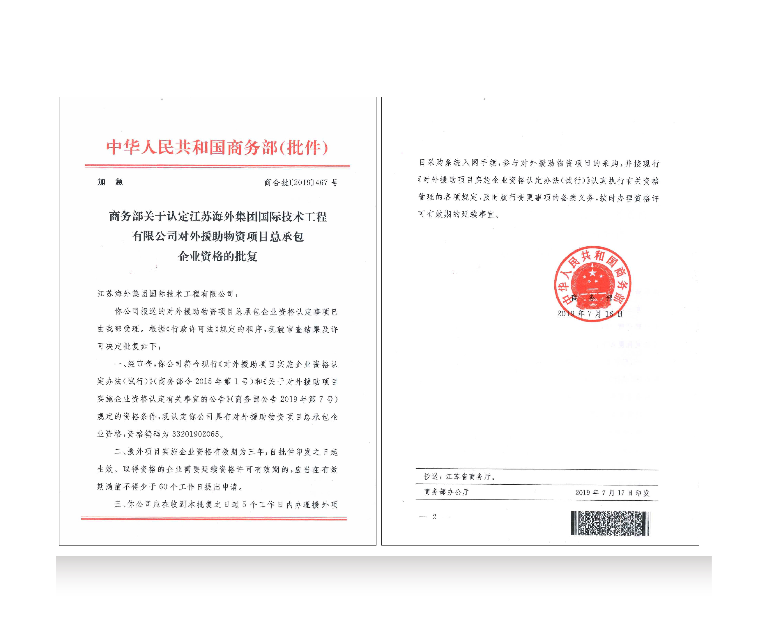 對(duì)外援助物資項(xiàng)目總承包企業(yè)資格批復(fù)