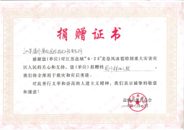鹽城龍卷風(fēng)災(zāi)害捐贈證書